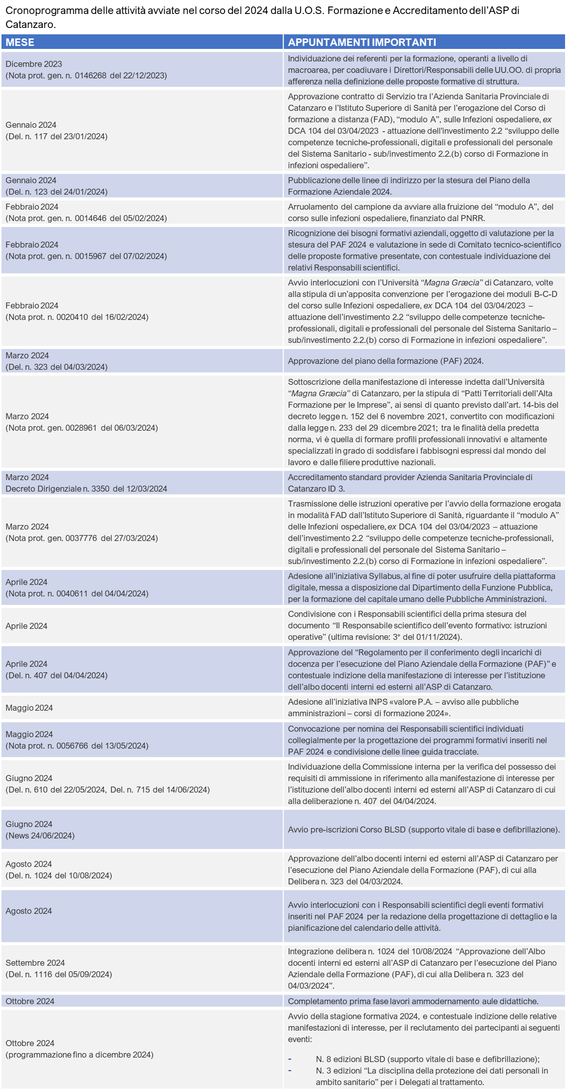 Attività avviate nel corso del 2024 – il cronoprogramma