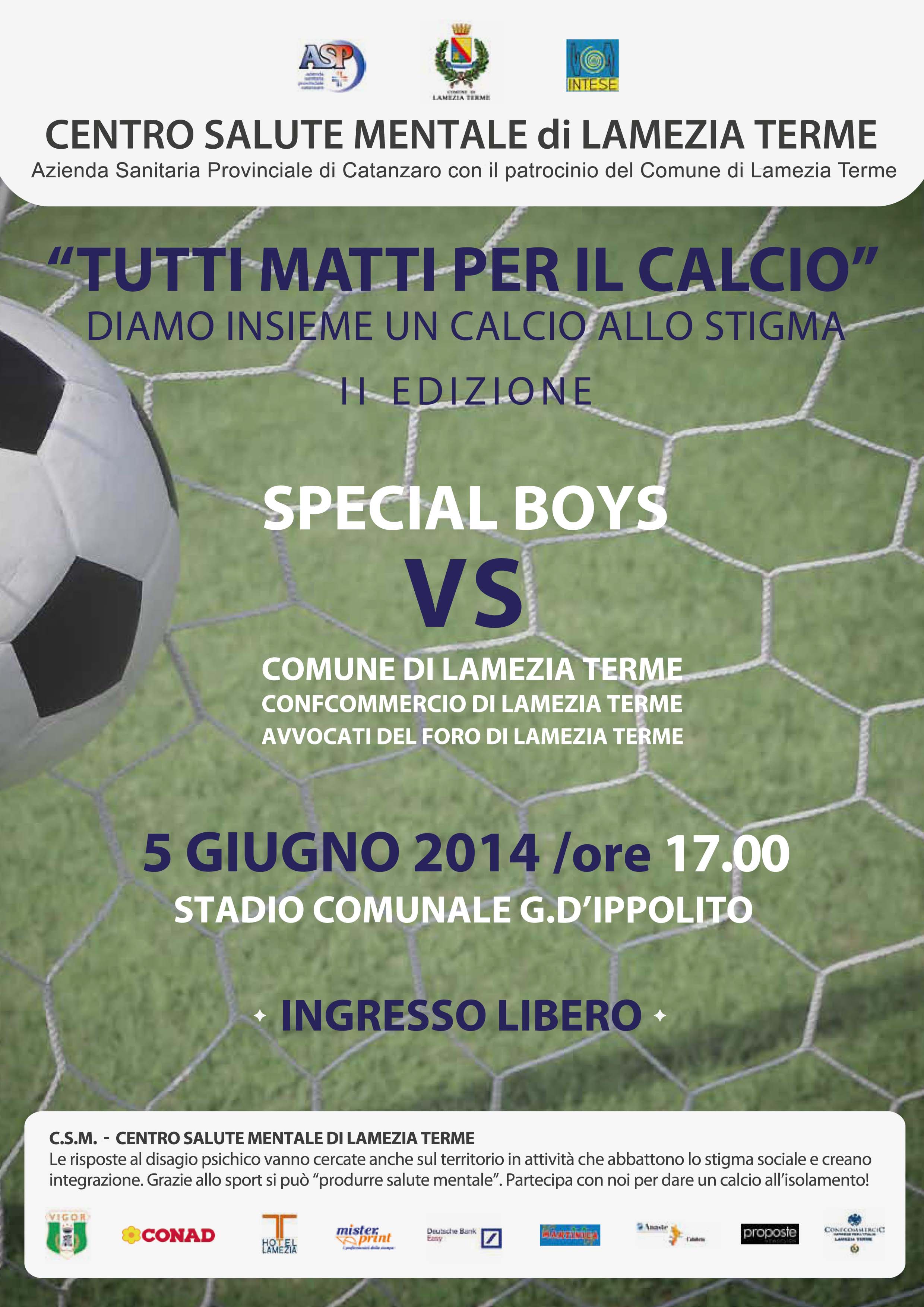 (ASP) - Catanzaro, 28 maggio 2014 - E' convocata per venerdì 30 maggio, alle ore 11:00, nella sala "Napolitano" del Comune di Lamezia Terme, via Sen. Arturo Perugini, una conferenza stampa per presentare la seconda edizione della manifestazione di salute e sport "Tutti matti per il calcio". L'iniziativa, organizzata dal Centro di Salute Mentale di Lamezia Terme, diretto dalla Dott.ssa Rossella Manfredi, e dalla Dott.ssa Sonia Graziano, psichiatra del CSM, responsabile del progetto, si terrà giovedì 5 giugno nello stadio comunale "G. d'Ippolito".