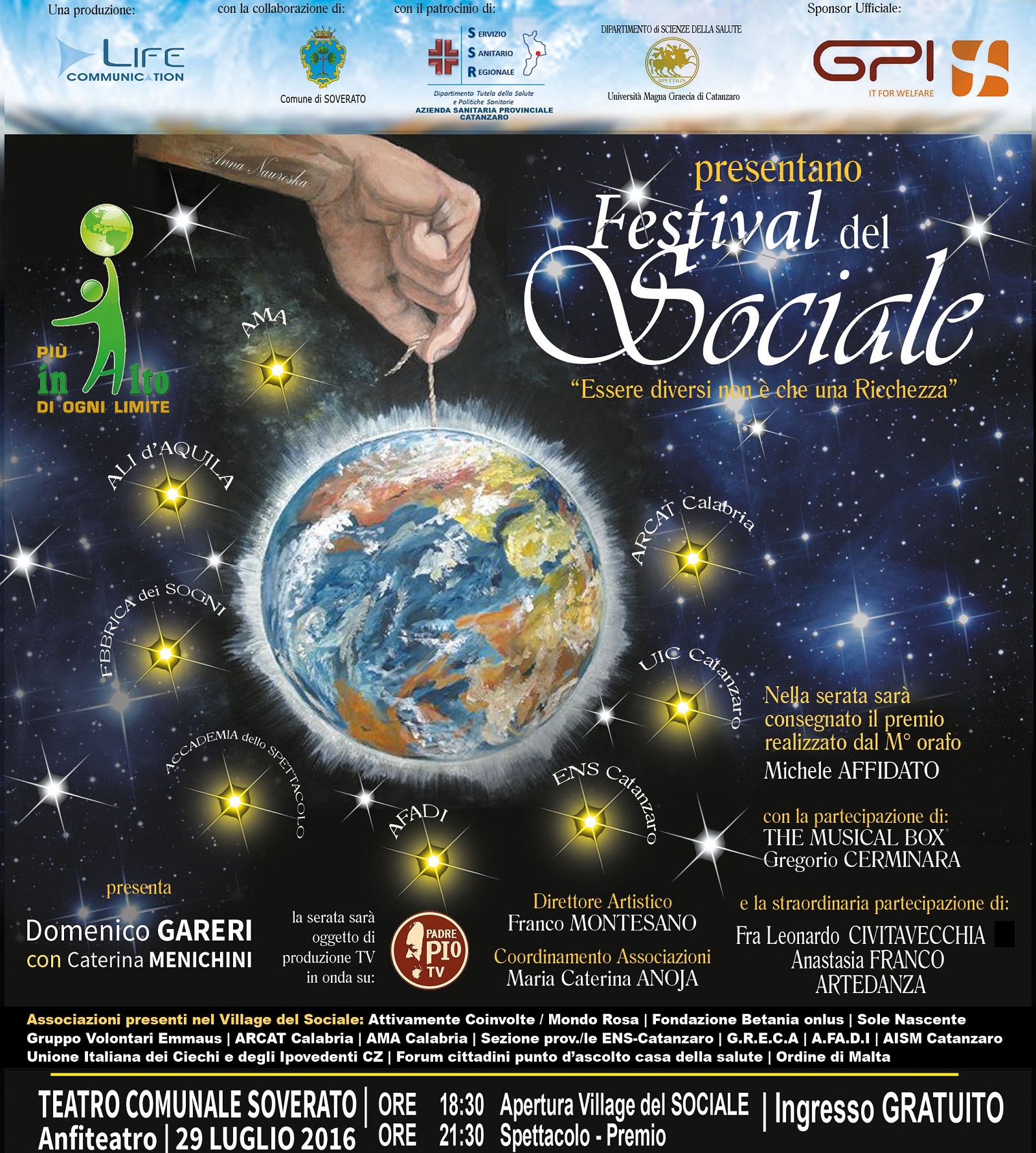 A spiegare le finalità dell'evento è il conduttore Domenico Gareri il quale sottolinea che in questa edizione sarà, in particolare, il mondo della sanità a diventare "ambasciatore" del sociale: "Oggi più che mai - commenta Gareri - è importante sensibilizzare la cittadinanza sul fatto che la salute non è legata solo all'uso dei farmaci, ma anche all'adozione di un corretto stile di vita. Per questo motivo, il Festival diventa uno strumento di comunicazione per promuovere i servizi territoriali di quella sanità positiva di cui purtroppo non si parla quasi mai. In questa ottica, le fasce deboli possono ergersi ad esempio positivo dimostrando come, mettendo in luce le proprie diverse abilità, è possibile far emergere il meglio di se". Il Festival sarà realizzato grazie alla sensibilità e alla collaborazione del Comune di Soverato e al patrocinio dell'Asp di Catanzaro, diretto da Giuseppe Perri, e del dipartimento della Salute dell'Università Magna Graecia di Catanzaro, guidato dal prof. Giovanbattista De Sarro. Durante la serata sarà consegnato il Premio Festival del sociale, realizzato da Michele Affidato, e assegnato da una giuria prestigiosa presieduta da S.E. mons Vincenzo Bertolone, arcivescovo di Catanzaro-Squillace e presidente della Cec Calabria, e composta dagli stessi Perri e De Sarro insieme al presidente del Gruppo Giovani imprenditori di Confindustria Catanzaro, Caterina Froio.