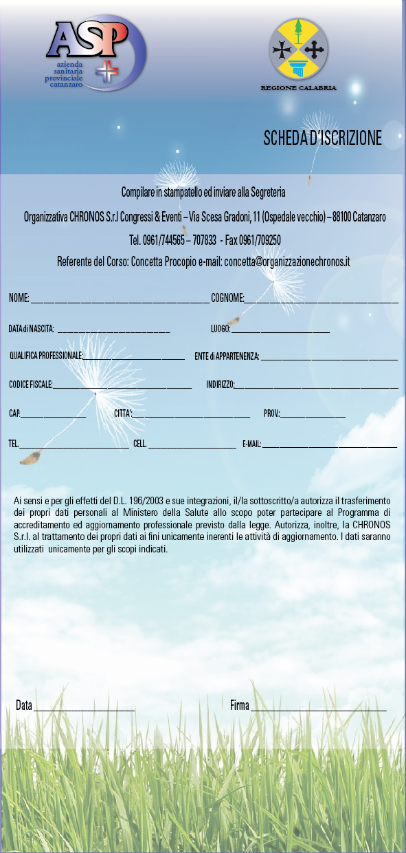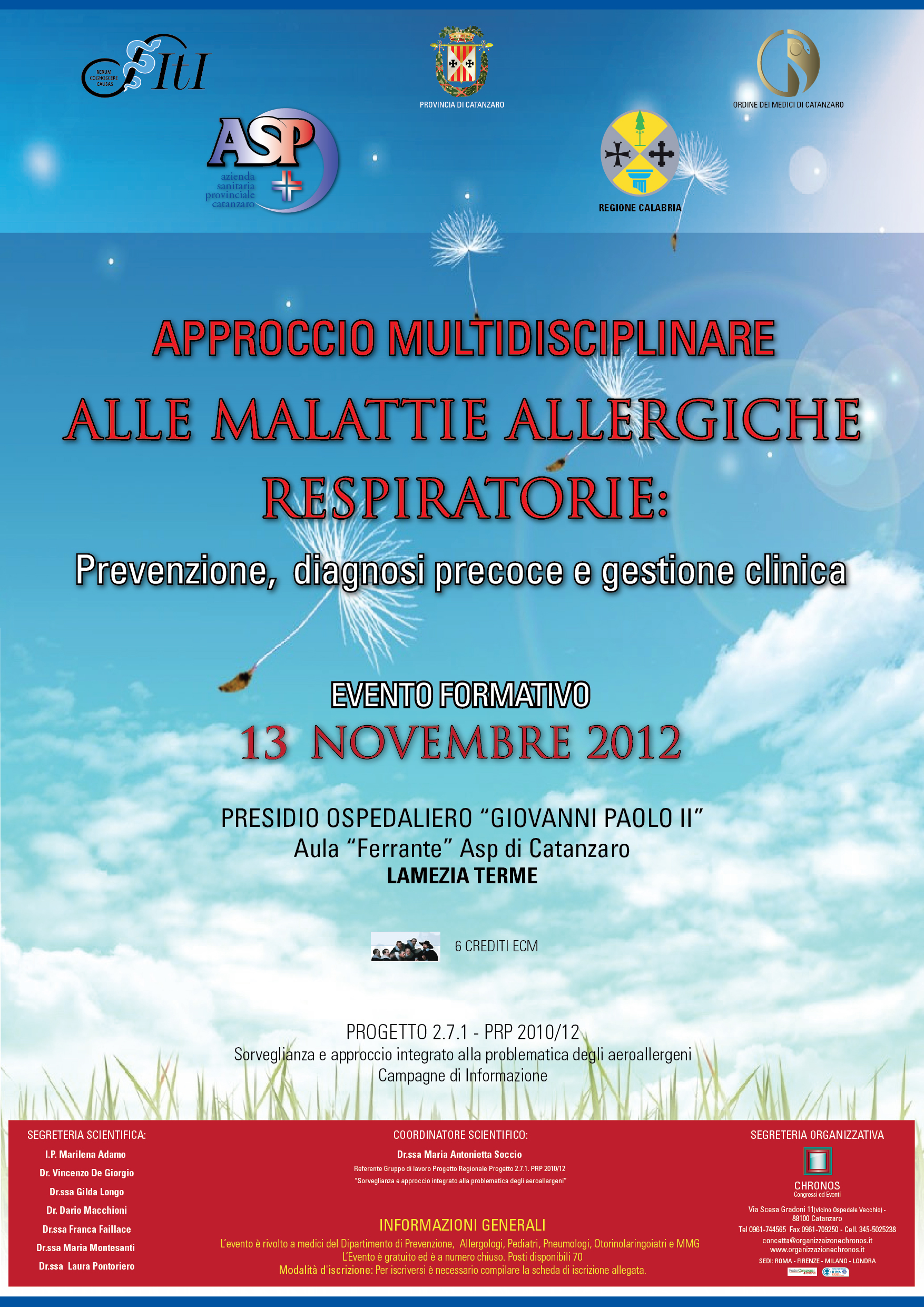 Programma e presentazione dell'evento formativo programmato nell'ambito delle attività del Progetto 2.7.1 del PRP 2010-12 della Regione Calabria, che vede l'ASP di Catanzaro capofila per la realizzazione dell'evento che si terrà il 13 novembre 2012 dalle ore 8:30 alle 18:00 presso la Sala "Ferrante" dell'ospedale "Giovanni Paolo II" di Lamezia Terme, dal titolo "Approccio multidisciplinare alle malattie allergiche respiratorie:prevenzione, diagnosi precoce e gestione clinica".