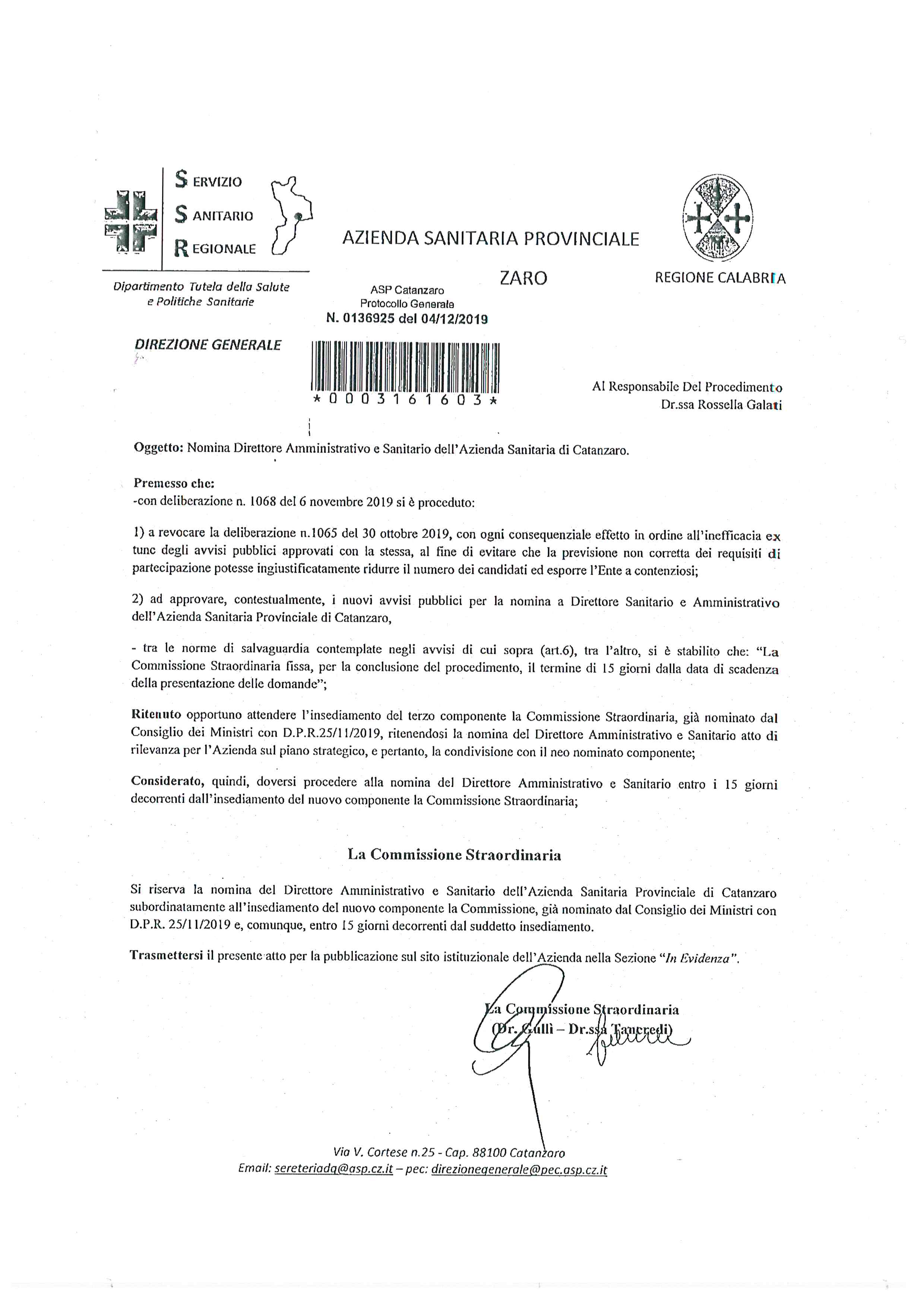 Nota a firma Commissione Straordinaria " Nomina Direttore Amministrativo e Sanitario dell'Azienda Sanitaria di Catanzaro".