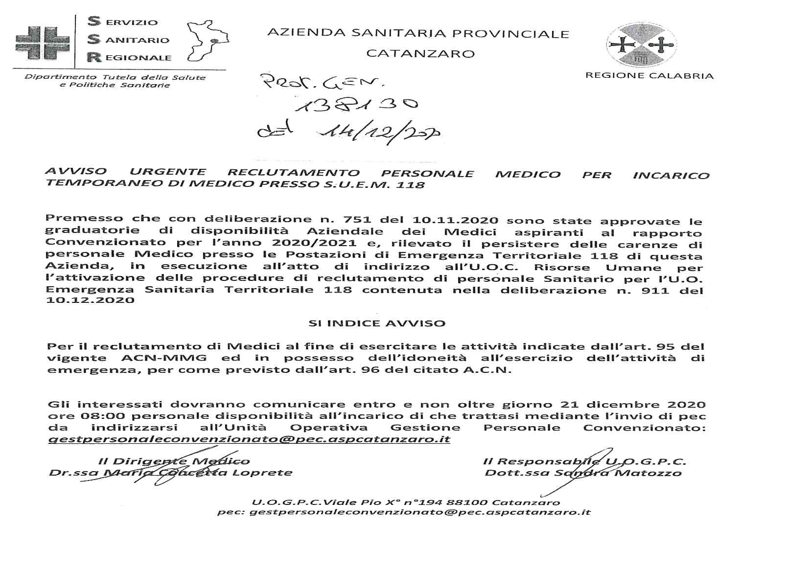 Reclutamento personale Medico per incarico temporaneo presso S.U.E.M. 118