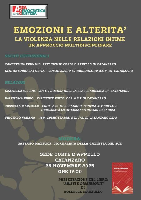 In occasione della Giornata internazionale per l’eliminazione della violenza contro le donne, l’associazione Area Democratica per la Giustizia organizza l’incontro “Emozioni e Alterità: la violenza nelle relazioni intime – Un approccio multidisciplinare”, un momento di confronto dedicato all’analisi dei fenomeni di violenza nelle relazioni affettive, esaminati attraverso prospettive giuridiche, psicologiche e sociali.